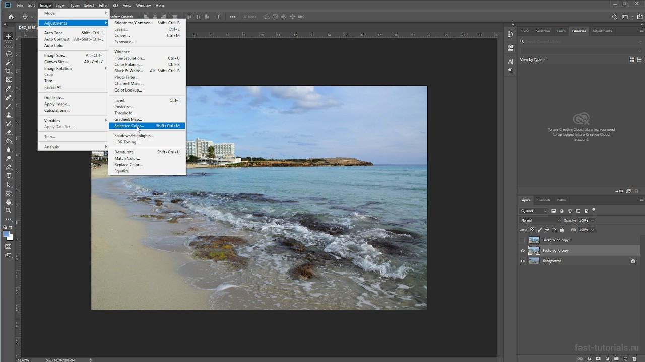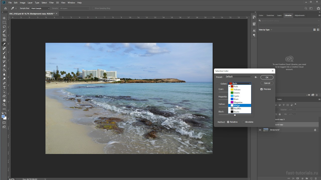 Image → Adjustments → Selective colorДанный инструмент позволяет контролировать основные цвета изображения.