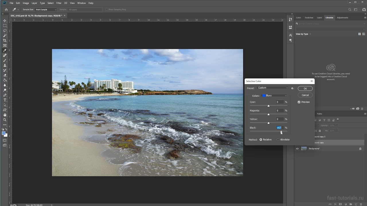 Выберите голубой цвет. Давайте добавим больше голубого, чтобы вода смотрелась красивее. Перетащите ползунок Cyan вправо: