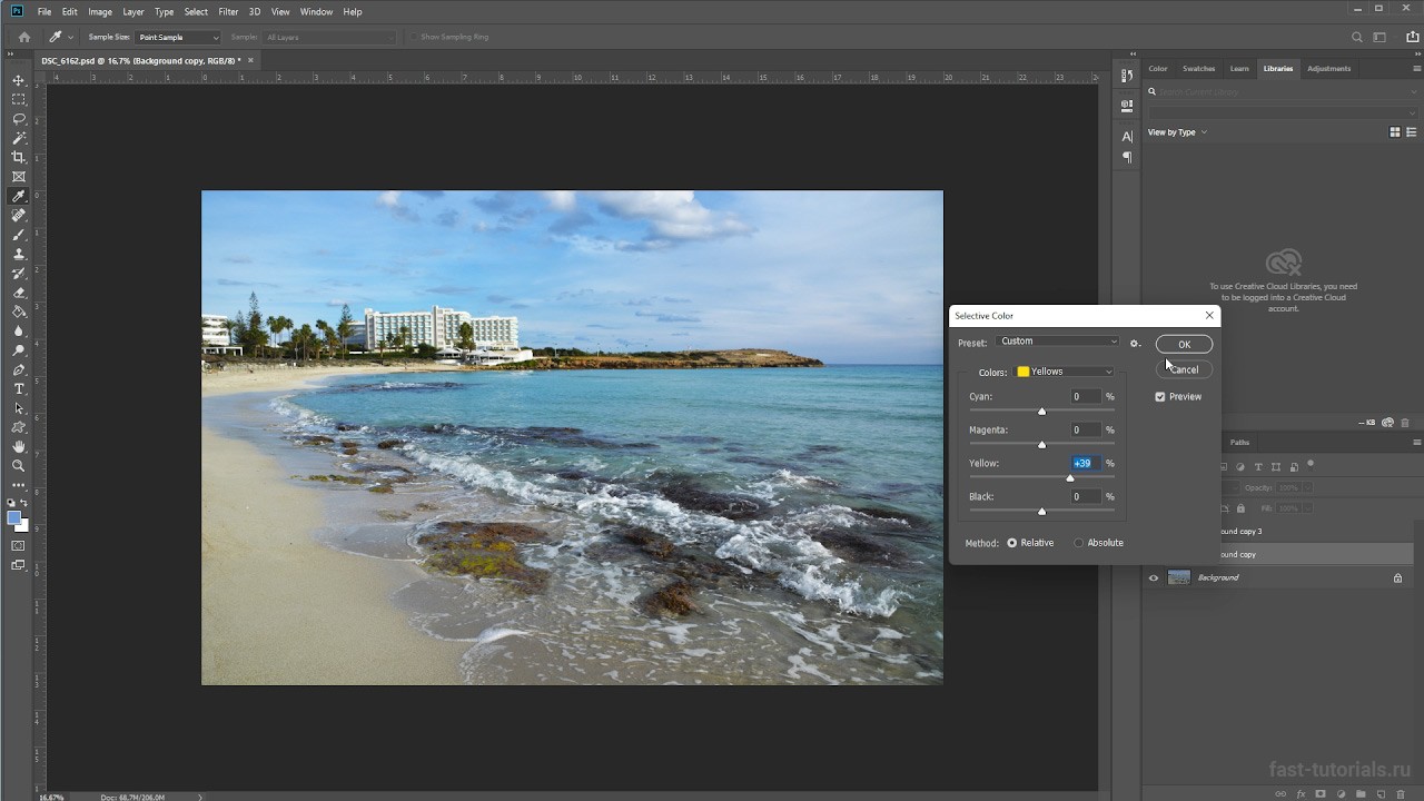 И в завершении можно немного ярче подкрасить песок. Во вкладке для желтого цвета увеличьте немного интенсивность желтого цвета у ползунка Yellow: