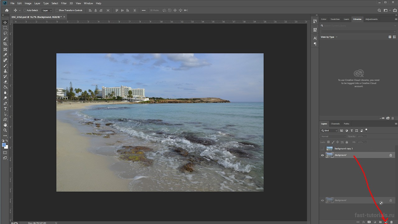 Откройте картинку в Photoshop , затем продублируйте исходный слой на новый методом перетаскивания на иконку нового слоя (“Create a new layer”):